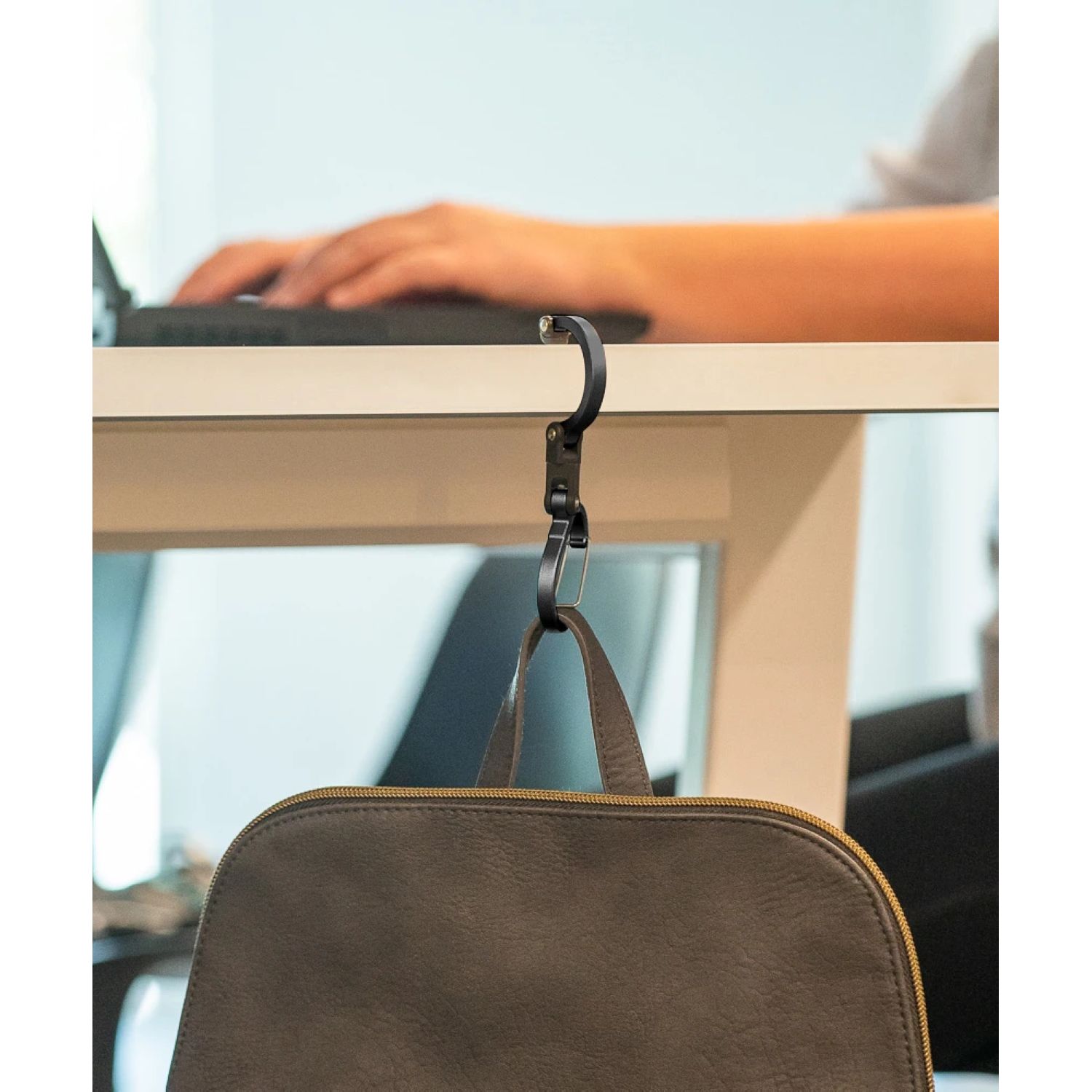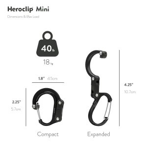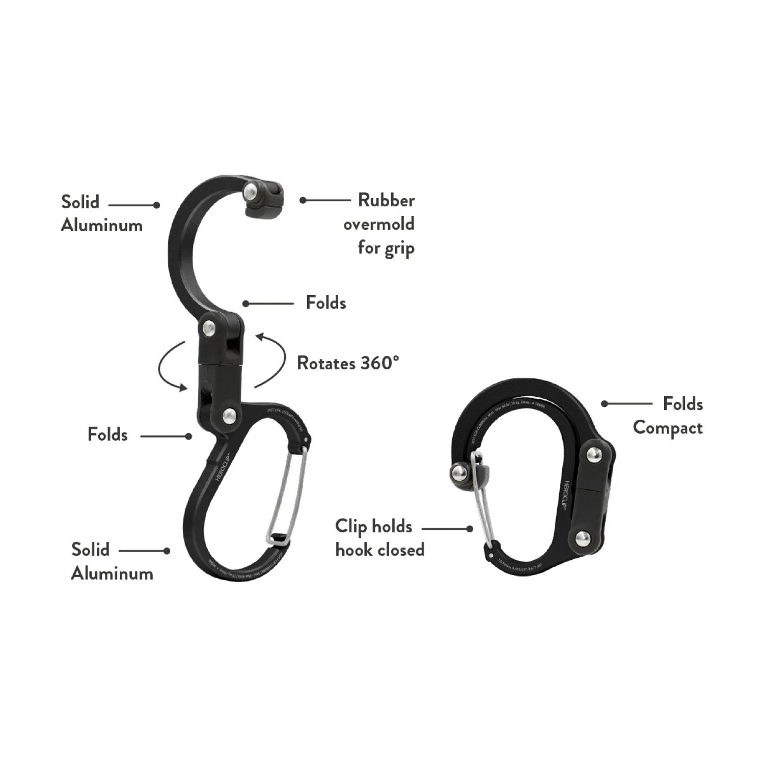 Keep your bags off the dirty floor! In 5 seconds, the Heroclip transforms into a rubber-edged hook for your bag, and packs neatly into a carabiner after.