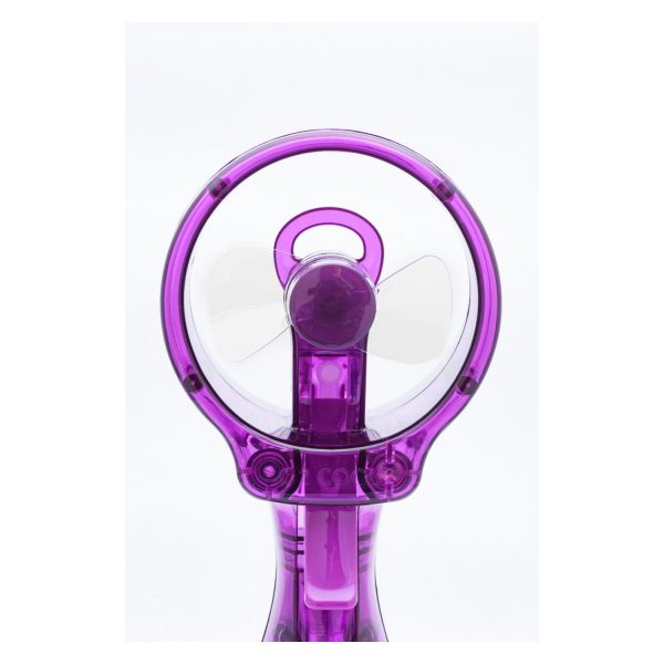 - Battery-powered fan has a manual misting function