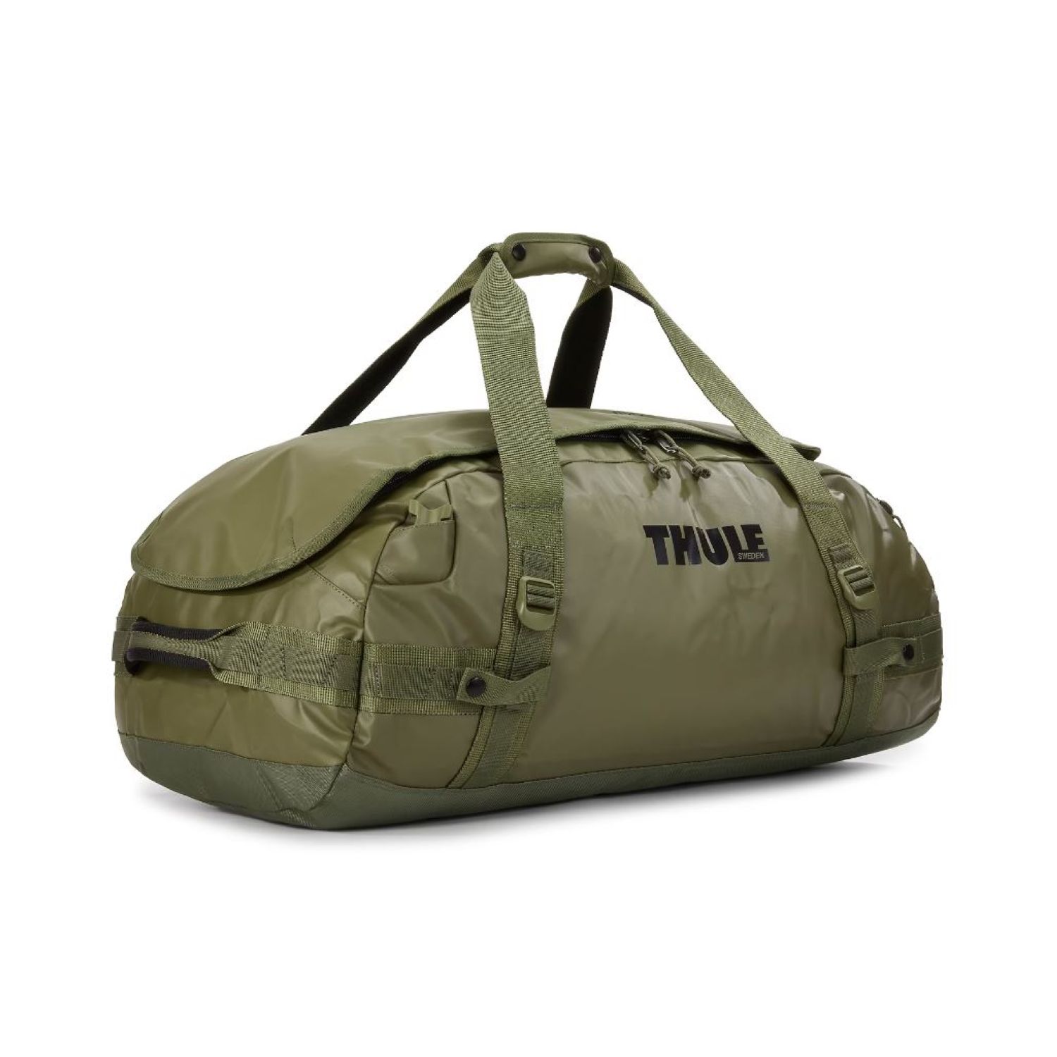 Thule Chasm 70L duffel bag is a rugged, weather-resistant bag that can be converted into a backpack with removable shoulder straps.
